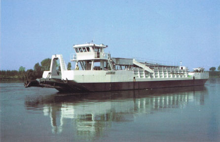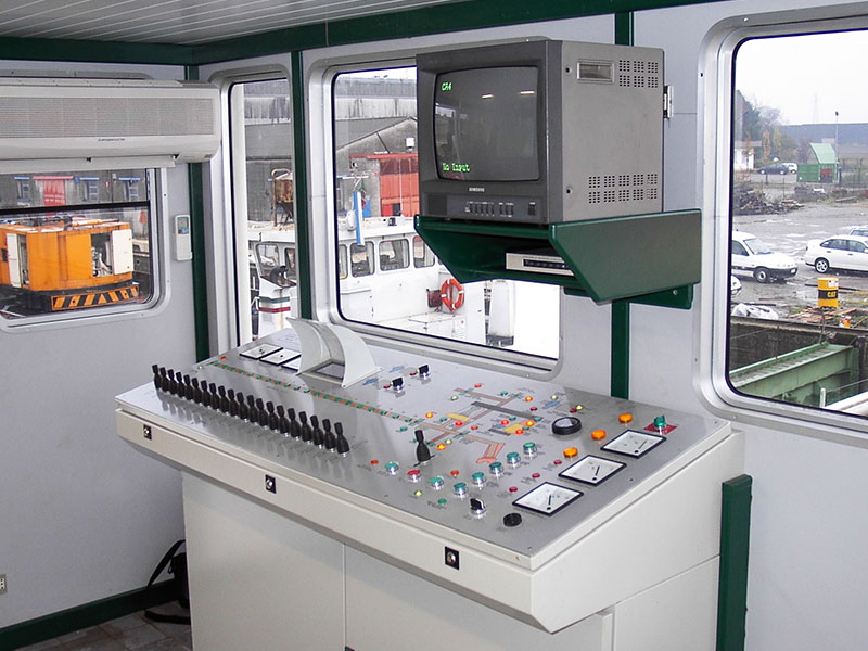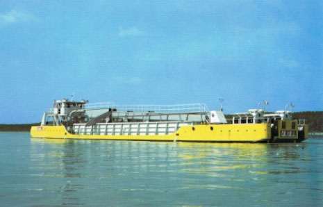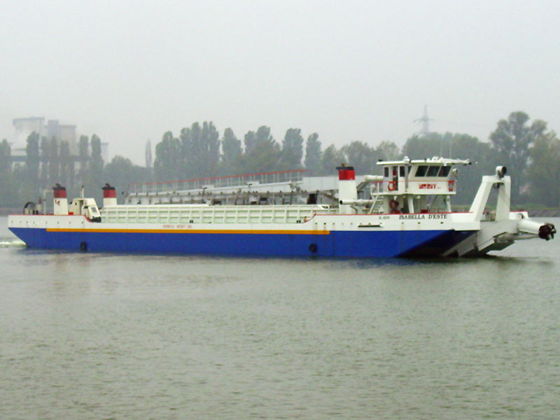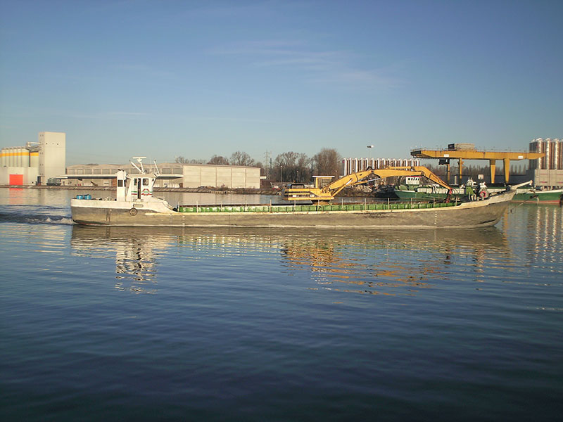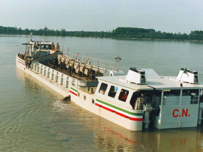 Costruzioni Navali started building motor ships for excavating and inert transportation at the beginning of sixties. First units, equipped with diggers, were extracting gravel from Po and Ticino rivers beds. As time went on, the massive request led to the construction of bigger and modern concept boats, equipped with dredging pump and cargo hold. Today the loading and unloading operations are steered by a PLC panel which energizes pumps, clutch, valves and other components, according to the selected working program. In addition to facilitate the tasks of the operator, the system protects the ship machinery from damage caused by a wrong use; for example, it is impossible to insert the clutch of the dredging pump if the diesel engine is not at a low engine speed or to operate the hydraulic gates if the lubricating - washing system does not have the correct pressure.