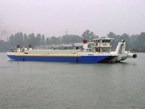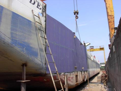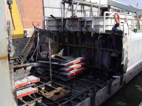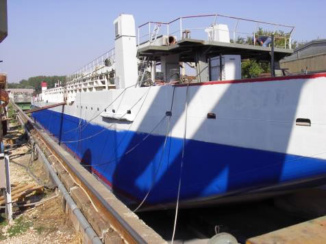 Conversion from a motor ship used to transport salt. Elongation by 6 meters, building of pump room and cargo holds with the corresponding systems of dredging. Because of strong internal corrosion, the bottom sheets had to be totally replaced.